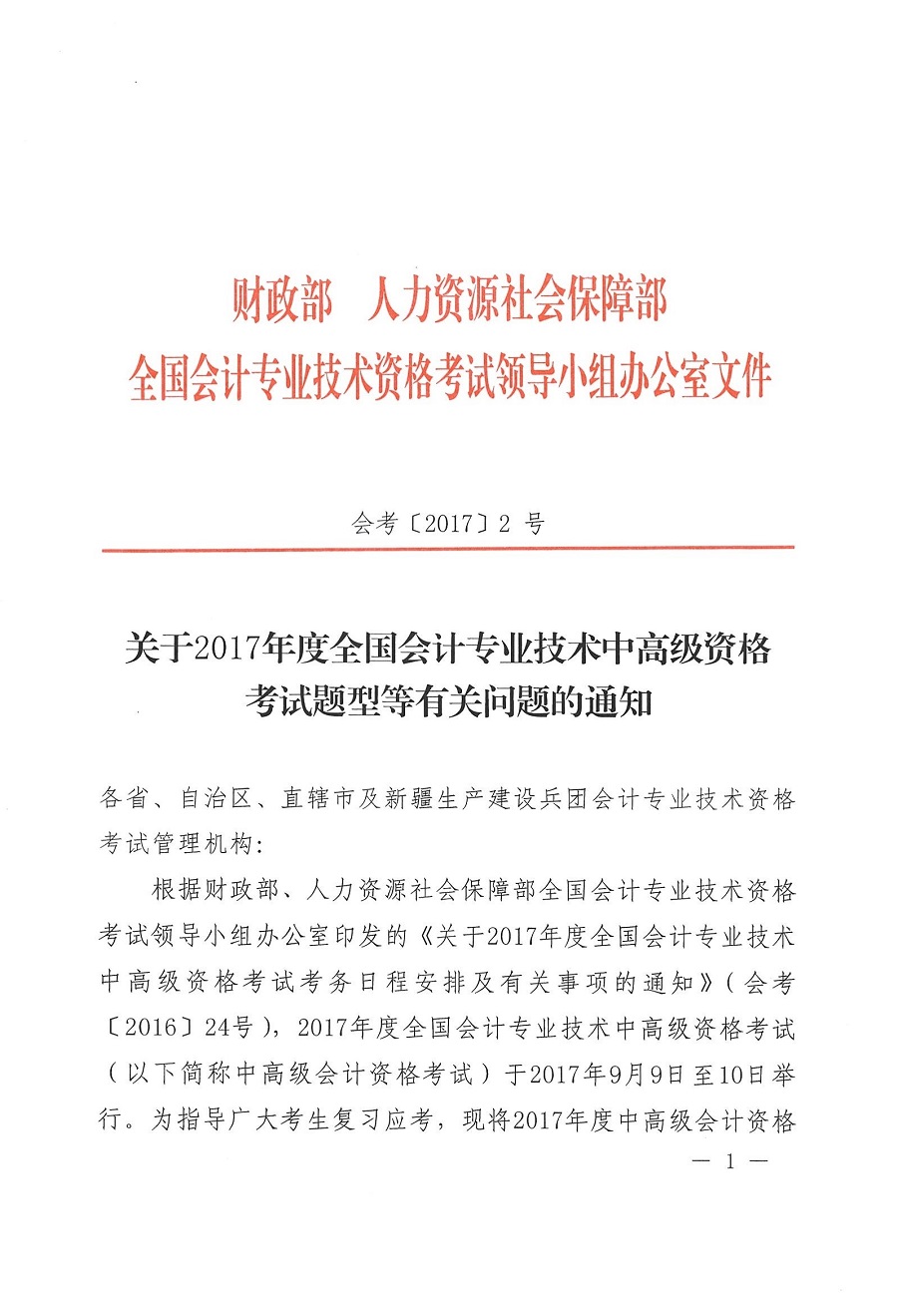 关于2017年度全国会计专业技术中高级资格考试题型等有关问题的通知